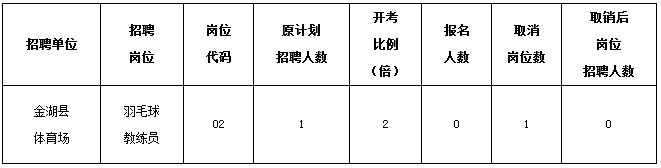 2015年金湖縣體育局公開招聘事業(yè)單位工作人員報名工作已經(jīng)結(jié)束。根據(jù)《2015年金湖縣體育局公開招聘事業(yè)單位工作人員公告》的規(guī)定,對達(dá)不到開考比例的招聘崗位予以取消?,F(xiàn)將取消崗位公告如下: