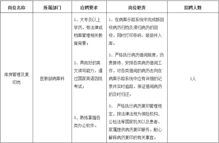 我院病案科因工作需要,現(xiàn)面向社會(huì)公開招聘1名庫(kù)房管理及復(fù)印人員,詳情如下: