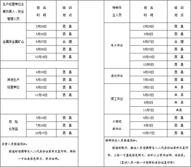 原標(biāo)題:涼山州安全技術(shù)檢測中心2016年安全管理人員、特種作業(yè)人員培訓(xùn)時(shí)間安排公告