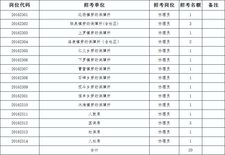 各鎮(zhèn)(鄉(xiāng))就業(yè)和社會公共服務(wù)機構(gòu)協(xié)理員共20名。珙縣公開招考基層就業(yè)和社會公共服務(wù)機構(gòu)協(xié)理員崗位表: