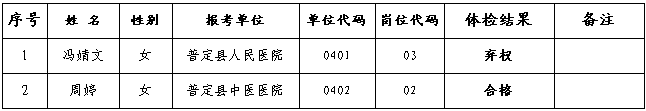 備注:普定縣面向社會(huì)公開招聘衛(wèi)生專業(yè)技術(shù)人員復(fù)檢或補(bǔ)檢合格人員進(jìn)入考察環(huán)節(jié),棄權(quán)人員取消考察資格。