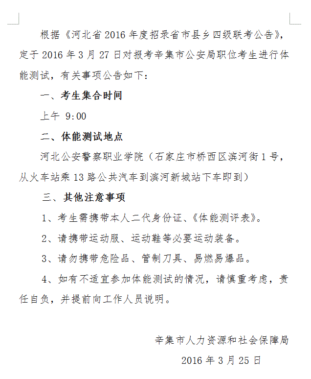 2016河北省市縣鄉(xiāng)四級(jí)聯(lián)考報(bào)考辛集市公安局職位考生體能測(cè)評(píng)安排