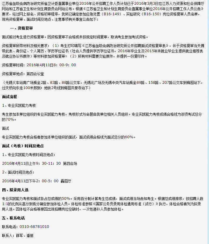 原標題:江蘇省血吸蟲病防治研究所2016年公開招聘工作人員面試公告