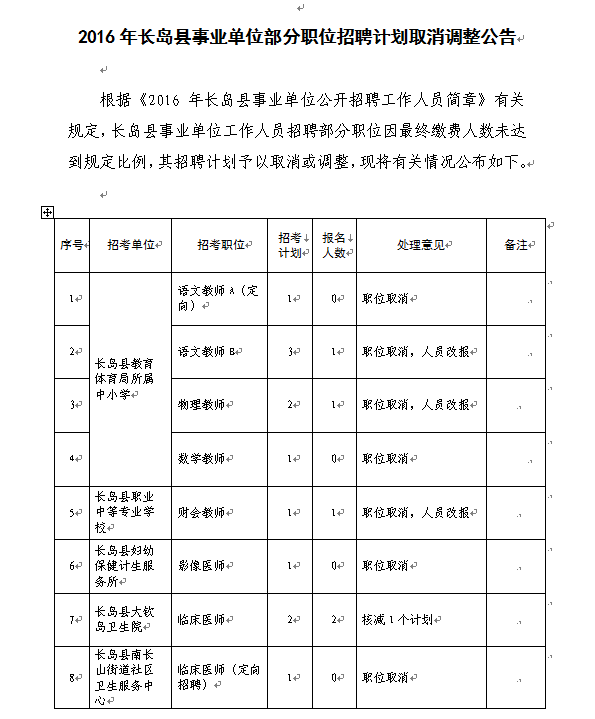 2016山東長島縣事業(yè)單位招聘職位計劃取消調(diào)整公告