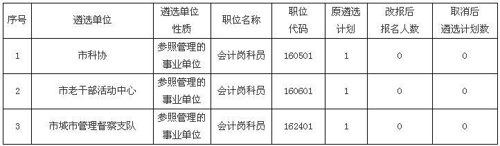 吉安市市直單位2016年公開遴選公務員(參照管理單位工作人員)報名工作已結束。根據《吉安市市直單位2016年公開遴選公務員(參照管理單位工作人員)公告》規(guī)定,筆試開考比例不得低于1:5,現將經改報后仍未達到開考比例的下列遴選職位計劃予以取消。