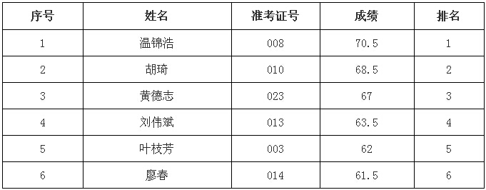 根據(jù)《贛州市政府法制辦下屬事業(yè)單位面向全市公開考選工作人員實施方案》有關要求,在市人力資源和社會局的監(jiān)督指導下,我辦于4月24日上午組織進行了公開考選事業(yè)單位工作人員筆試工作。根據(jù)公開考選實施方案,按筆試成績從到低分1∶3的比例確定面試人選(與入闈最后一名成績并列者一并列入)的要求,現(xiàn)將入闈面試人員名單公告如下: