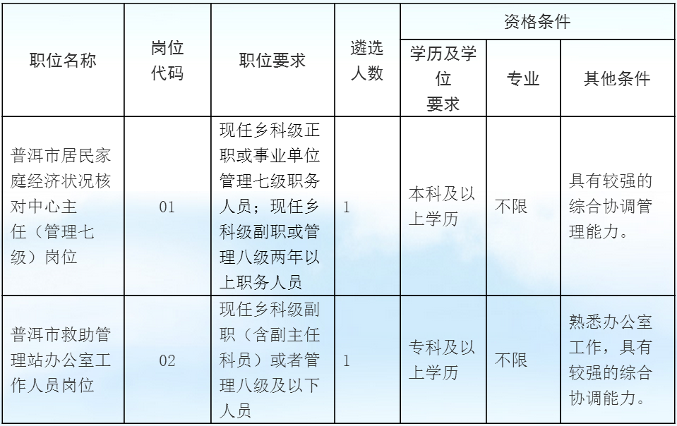 普洱市居民家庭經(jīng)濟(jì)狀況核對(duì)中心主任1名(管理七級(jí));普洱市救助管理站辦公室工作人員1名。職位要求具體如下: