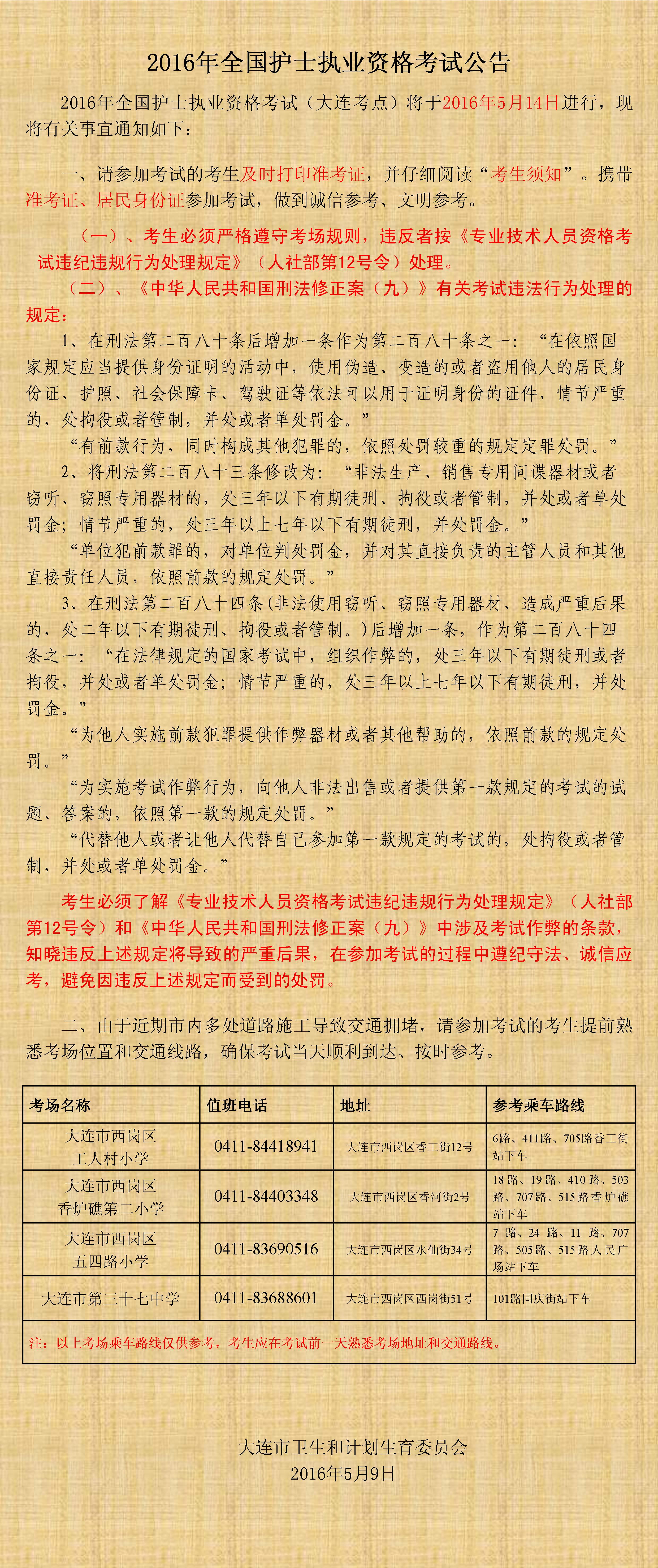 2016遼寧大連護士執(zhí)業(yè)資格考試公告