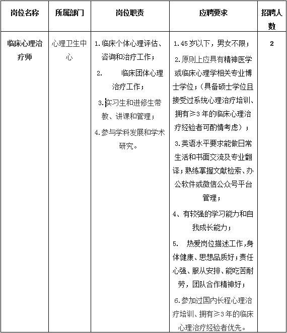 我院心理衛(wèi)生中心現(xiàn)在面向社會(huì)公開(kāi)招聘臨床心理治療師兩名: