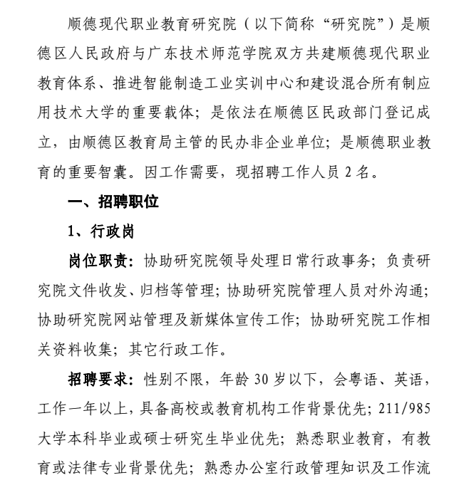 2016廣東順德現(xiàn)代職業(yè)教育研究院招聘公告【2人】
