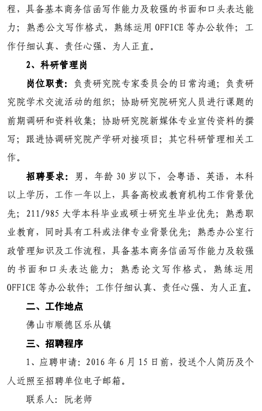 2016廣東順德現(xiàn)代職業(yè)教育研究院招聘公告【2人】