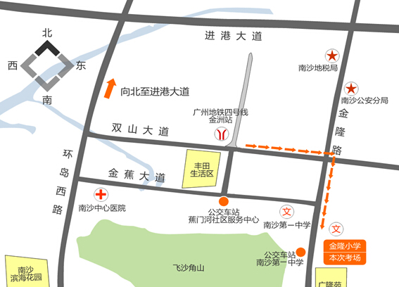 南沙區(qū)金隆小學(地鐵4號線—金洲站下,步行約800米,請按箭頭指引方向步行)。