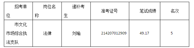 鄂州市文體新廣系統(tǒng)2016年事業(yè)單位公開招聘資格復(fù)審,因市文化市場綜合執(zhí)法支隊法律崗位第2名考生劉家麟放棄資格復(fù)審,根據(jù)《鄂州市事業(yè)單位2016年度公開招聘工作人員公告》有關(guān)規(guī)定,在報考同一崗位考生中按照筆試成績從到低分依次遞補的原則,遞補以下考生為資格復(fù)審人選: