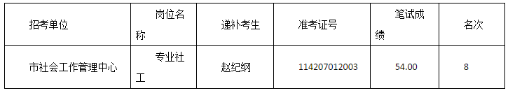 鄂州市民政局系統(tǒng)2016年事業(yè)單位公開招聘資格復審,因第4名考生向前放棄資格復審,根據(jù)《鄂州市事業(yè)單位2016年度公開招聘工作人員公告》有關(guān)規(guī)定,在報考同一崗位考生中按照筆試成績從到低分依次遞補的原則,遞補以下考生為資格復審人選: