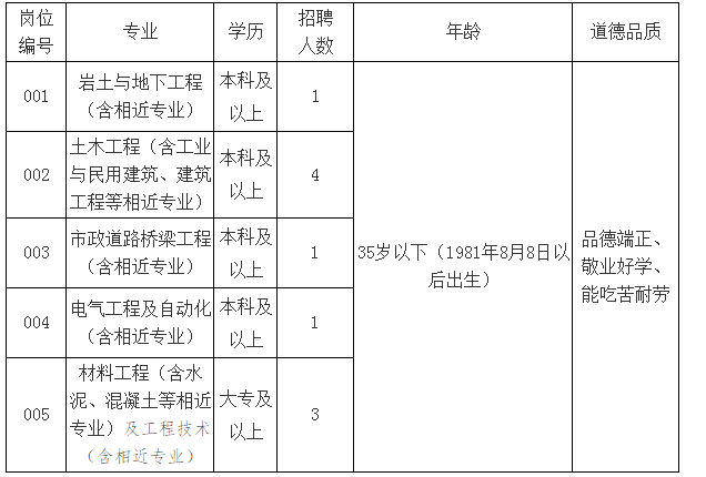 注:1、巖土與地下工程專業(yè)應(yīng)聘人員如有國家注冊巖土工程師證書的年齡可以放寬至45歲,且待遇另行商定。