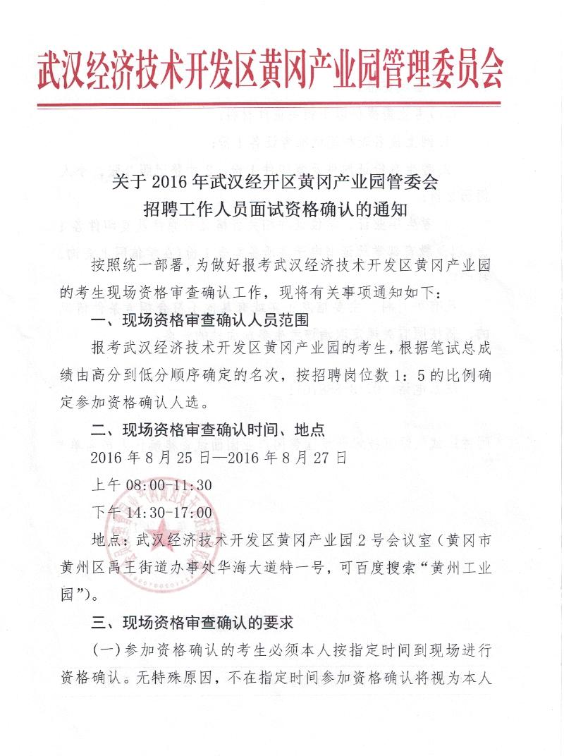 2016湖北武漢經(jīng)開區(qū)黃岡產(chǎn)業(yè)園管委會招聘面試資格確認(rèn)通知