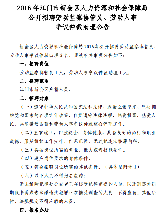 2016廣東江門市新會區(qū)人力資源和社會局招聘勞動監(jiān)察協(xié)管員公告【招2人】