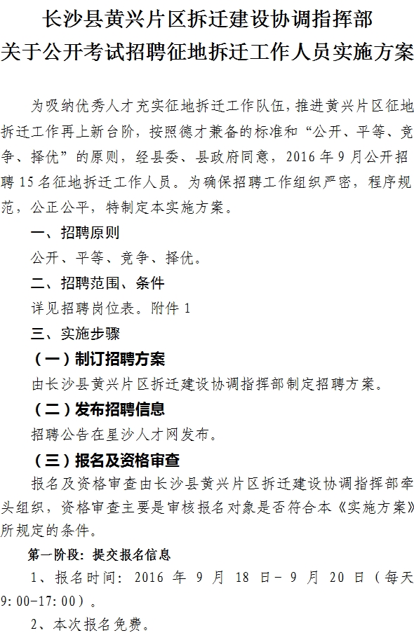 原標(biāo)題:長沙縣黃興片區(qū)拆遷建設(shè)協(xié)調(diào)指揮部關(guān)于公開考試招聘征地拆遷工作人員實施方案