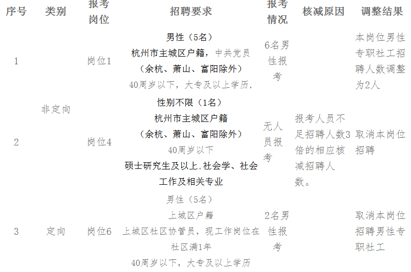 根據(jù)《上城區(qū)2016年度專職社區(qū)工作者招聘公告》關(guān)于“各招聘崗位報(bào)考人員不足招聘人數(shù)3倍的相應(yīng)核減招聘人數(shù)”的規(guī)定。調(diào)整后的招聘人數(shù)分別為: