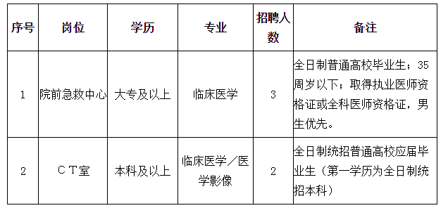 根據(jù)我院工作發(fā)展需要,我院CT室及120急救中心擬招聘工作人員5名,具體事項(xiàng)如下: