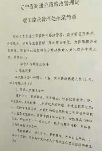 2016遼寧省高速公路路政管理局朝陽(yáng)路政管理處招聘【招15人】