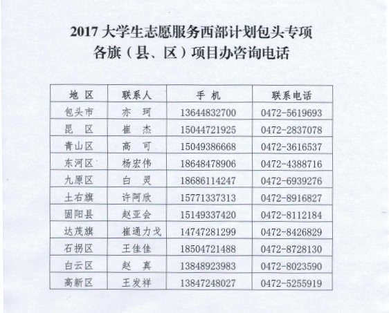 關(guān)于西部計劃包頭市地方項目報名,只要符合內(nèi)蒙古大學(xué)生志愿服務(wù)西部計劃地方項目招募條件(詳見實施方案預(yù)通知),沒有在大學(xué)生志愿服務(wù)西部計劃官方網(wǎng)站上報名或報名后未通過高校審核的,也可直接致電包頭市各旗縣區(qū)項目辦報名參加考試。