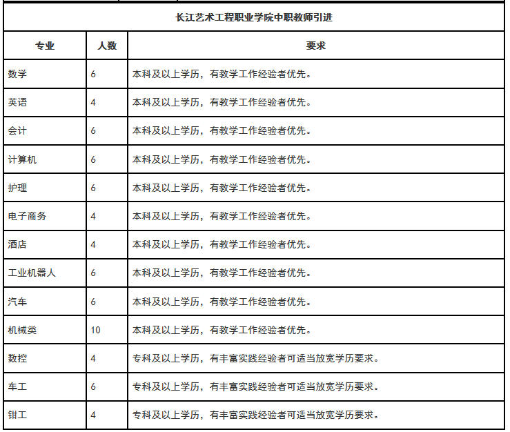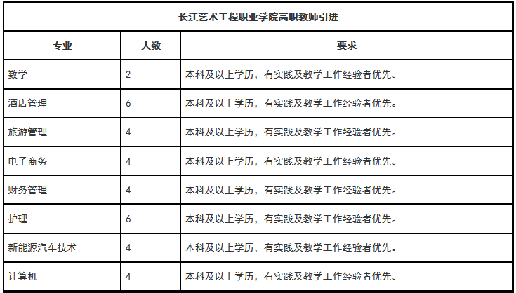 2.報名方式:請將個人簡歷、個人證件掃描件(畢業(yè)證、學歷證、資格證書等其它個人能力證明材料)以附件形式,按“應聘專業(yè)+姓名+畢業(yè)+學歷+專業(yè)+高校人才網”命名(如:“護理+張三+長江藝術工程職業(yè)學院+碩士+護理學+高校人才網”),將簡歷發(fā)送至cjysgc@126.com郵箱,請勿重復投遞。