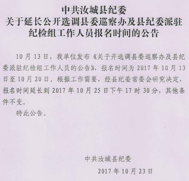 2017湖南汝城縣委巡察辦及縣紀(jì)委派駐紀(jì)檢組選調(diào)報(bào)名時(shí)間延長(zhǎng)通知