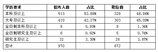 從招錄學(xué)歷來看,學(xué)歷門檻要求“本科及以上”的職位占總職位數(shù)的50.3%,占總職位數(shù)的一半以上,考生們要注意的是有9人、9個職位數(shù)僅限全日制本科以上學(xué)歷,還有6人、5個職位要求全日制研究生及以上,如果是通過自學(xué)考試、函授、成人教育、網(wǎng)絡(luò)教育、夜大、電大等方式取得的學(xué)歷不能報考要求全日制學(xué)歷的職位。