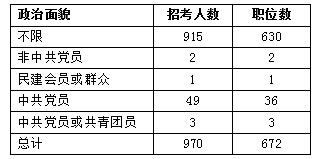 本次考試對政治面貌進行了不同的規(guī)定,有630個職位不限制政治面貌,中共黨員、各民族黨派人士以及群眾都可以報考,有36個職位僅限中共黨員報考,還有1個職位要求是民建會員或者群眾,如果政治面貌為黨員或者民主黨派的考生要確認(rèn)自己的證件及相關(guān)證明,萬無一失。