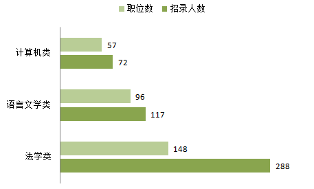 本次考試招錄中,法學(xué)類、語言文學(xué)類以及計算機類這三類專業(yè)需求量較大,其中尤以法學(xué)類專業(yè)人氣最旺,288個職位、148人招錄法學(xué)類人才,占到總職位數(shù)的22%,有法學(xué)類專業(yè)背景的考生有很大的選擇空間,要結(jié)合自身的學(xué)歷、資格證書等其他條件最終選出自己心儀的職位。