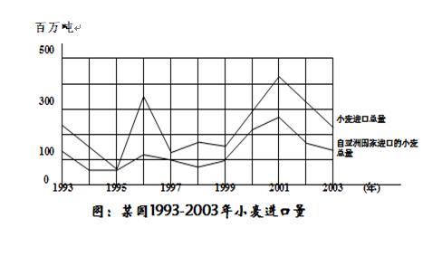 1.從1993年到1997年中,該國(guó)共從亞洲國(guó)家進(jìn)口多少百萬(wàn)噸小麥?