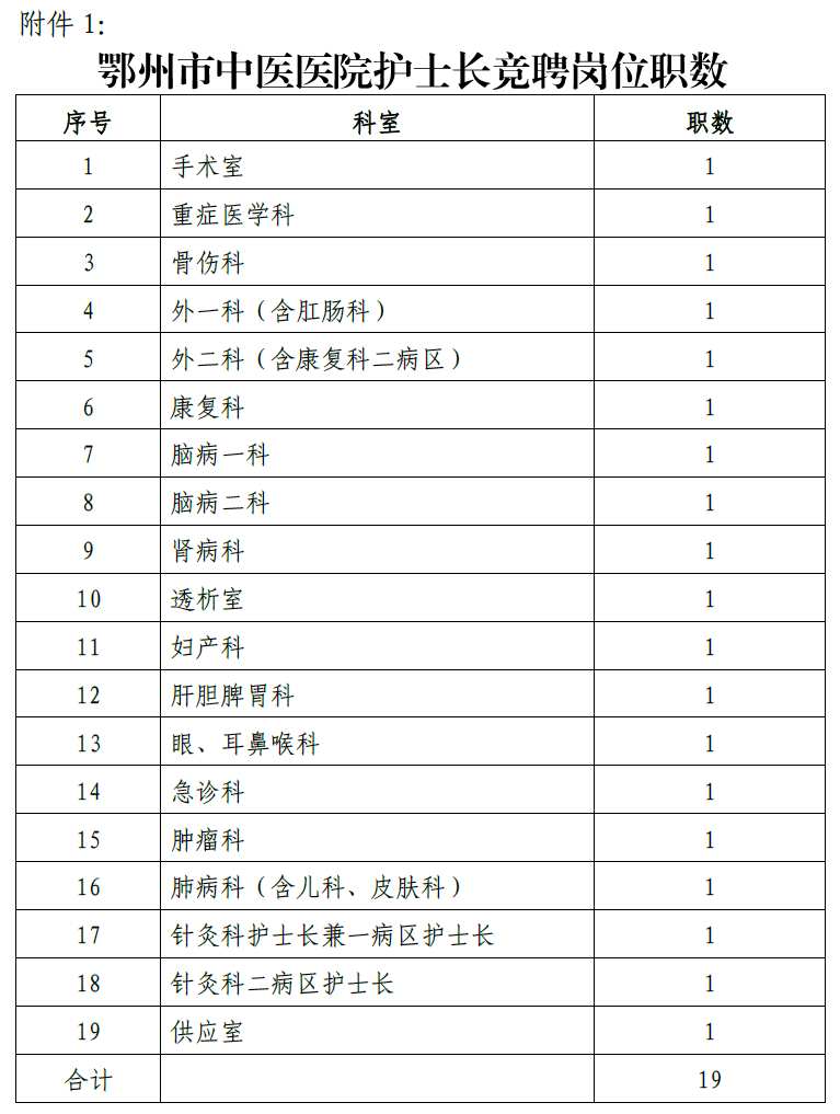 1.本次全院擬設(shè)護士長崗位19個(詳見附件1)。