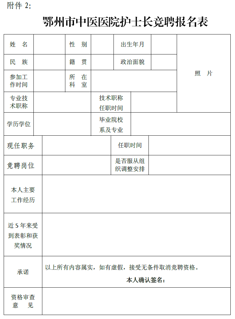 1.公開職數(shù)、個人報名。在醫(yī)院網(wǎng)站、微信公眾號、職工QQ群等媒體平臺發(fā)布競聘公告。根據(jù)公布的崗位職數(shù)和崗位條件,個人自愿填寫《護士長競聘報名表》(見附件2)。