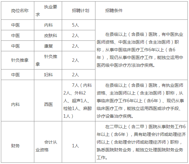 臨滄市中醫(yī)院此次公開(kāi)選調(diào)事業(yè)編制崗位21名,其中:中醫(yī)崗位13人(內(nèi)科5人、皮膚科2人、婦科2人、康復(fù)2人、針灸推拿崗位2人)、西醫(yī)崗位7人(麻醉1人、內(nèi)科2人、外科2人、超聲1人、檢驗(yàn)1人)、財(cái)務(wù)崗位1人。