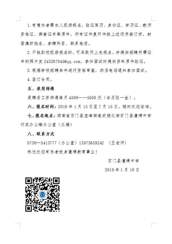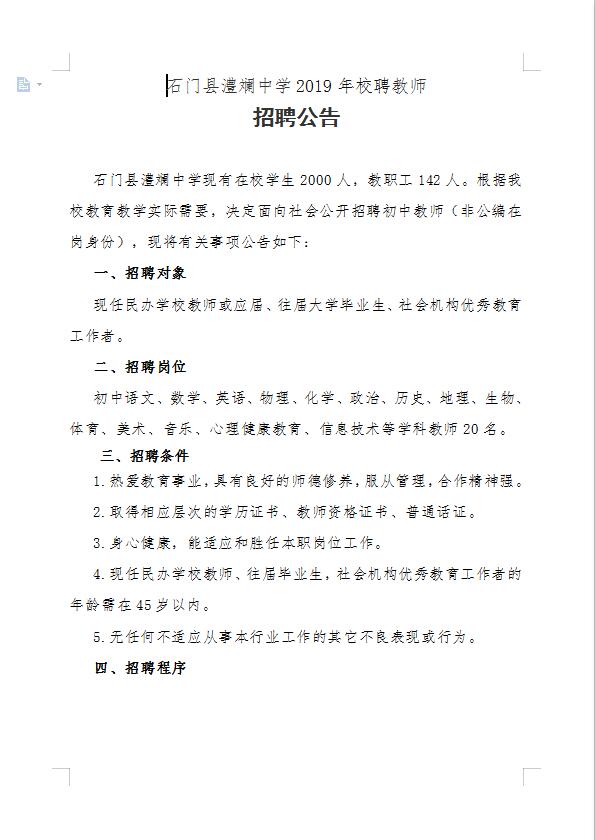原標(biāo)題:石門縣澧斕中學(xué)2019年校聘教師招聘公告