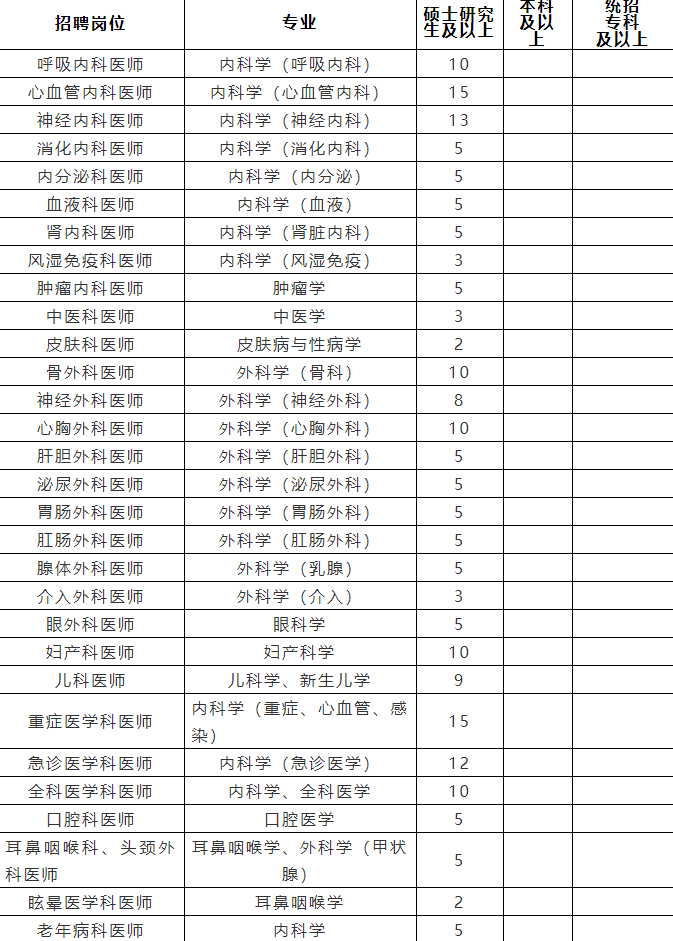 四、有工作經(jīng)歷者,醫(yī)療、醫(yī)技專業(yè)要求具有三甲醫(yī)院1年或二甲醫(yī)院2年及以上本專業(yè)臨床一線工作經(jīng)歷;護(hù)理專業(yè)要求具有三甲醫(yī)院2年或二甲醫(yī)院5年及以上本專業(yè)臨床一線工作經(jīng)歷,年齡35周歲以下。