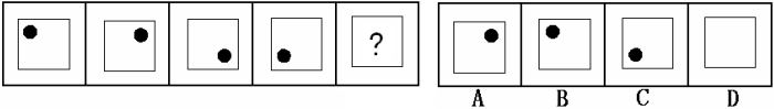 (答案:B。黑點(diǎn)在正方形中順時針移動。在第5個圖形中,應(yīng)該正好移動到左上角。)