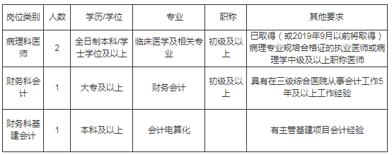 根據(jù)醫(yī)院工作需要,招聘病理科醫(yī)師、財(cái)務(wù)科會(huì)計(jì)等崗位工作人員共4人,具體條件如下: