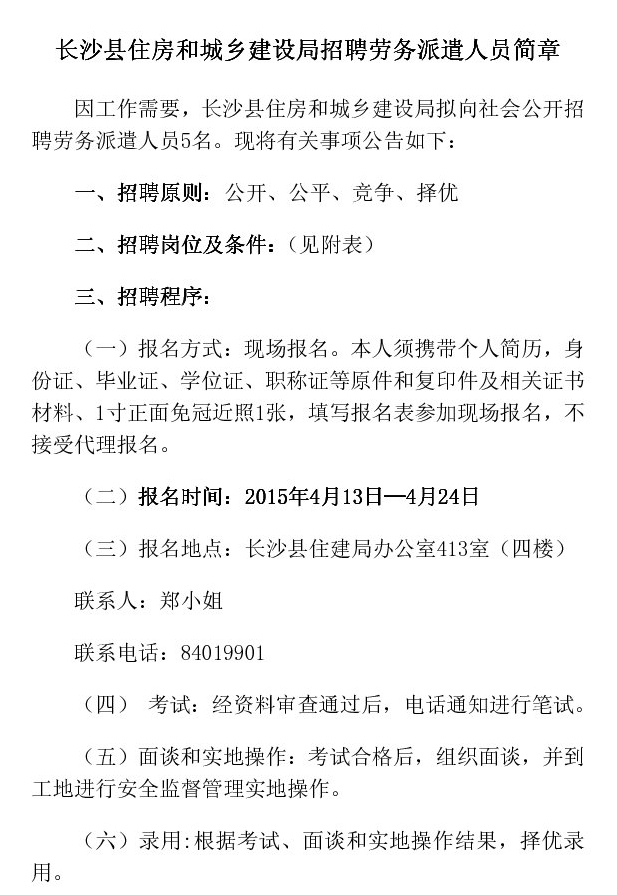 2015年湖南省長(zhǎng)沙縣住房和城鄉(xiāng)建設(shè)局招聘勞務(wù)派遣人員公告【招5名】