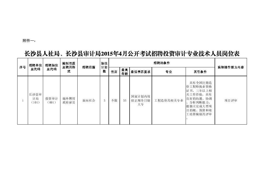 原標(biāo)題:長沙縣人力資源和社會局、長沙縣審計局2015年4月公開考試招聘投資審計專業(yè)技術(shù)人員簡章