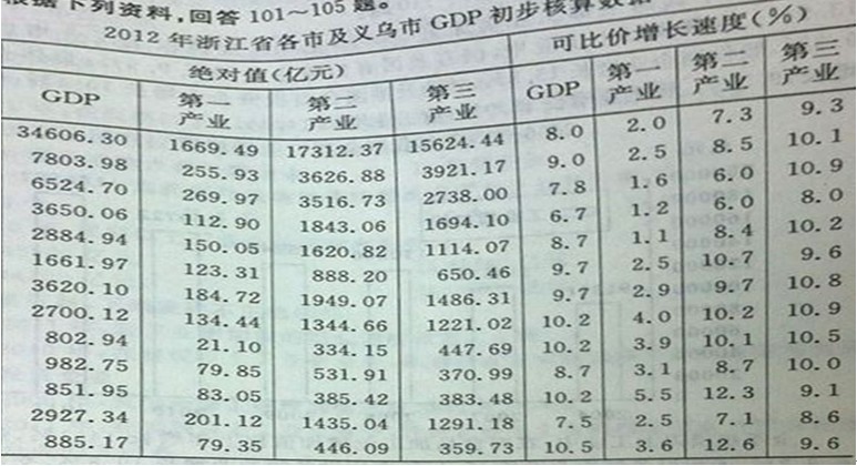 103.全省第三產(chǎn)業(yè)增加值第二多的市約是最少的: