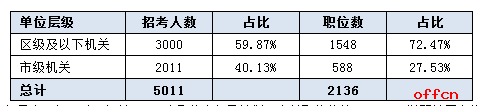 本次招錄中區(qū)級及以下機關(guān)1548個職位有招錄計劃,占總職位數(shù)的72.47%,說明基層崗位需求量比較大,成“公”概率更高,實力不是很強的考生,可以重點考慮區(qū)級以下機關(guān)職位。