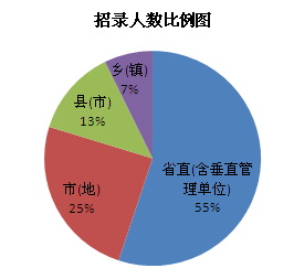 根據(jù)官方發(fā)布的職位表可知2014年度黑龍江省共招錄5897人,其中公務(wù)員5474人,,參照公務(wù)員法管理人員423人。本次招錄涵蓋省、市、縣、鄉(xiāng)各個(gè)層級(jí),省直(含垂直管理單位)依然為招錄大戶,占總招錄人數(shù)的55%。鄉(xiāng)鎮(zhèn)招錄人數(shù)最少,只占總招錄人數(shù)的7%。