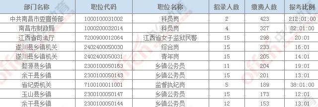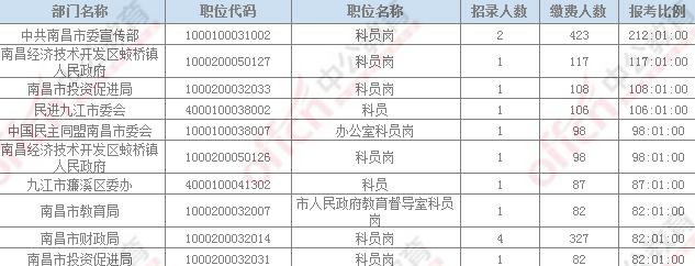 從今天的職位報(bào)名情況來(lái)看,報(bào)名人數(shù)最多的職位依然是“中共南昌市委宣傳部”,目前已經(jīng)繳費(fèi)423人,該職位計(jì)劃招考2人,報(bào)考比例212:1。該職位也是目前競(jìng)爭(zhēng)最激烈的職位。
