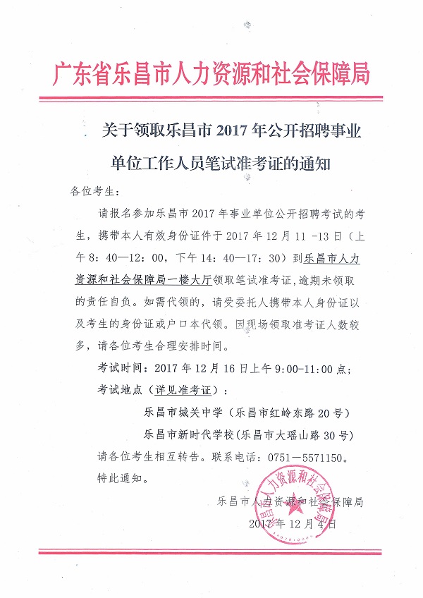 2017廣東韶關(guān)樂(lè)昌市事業(yè)單位招聘筆試準(zhǔn)考證領(lǐng)取通知