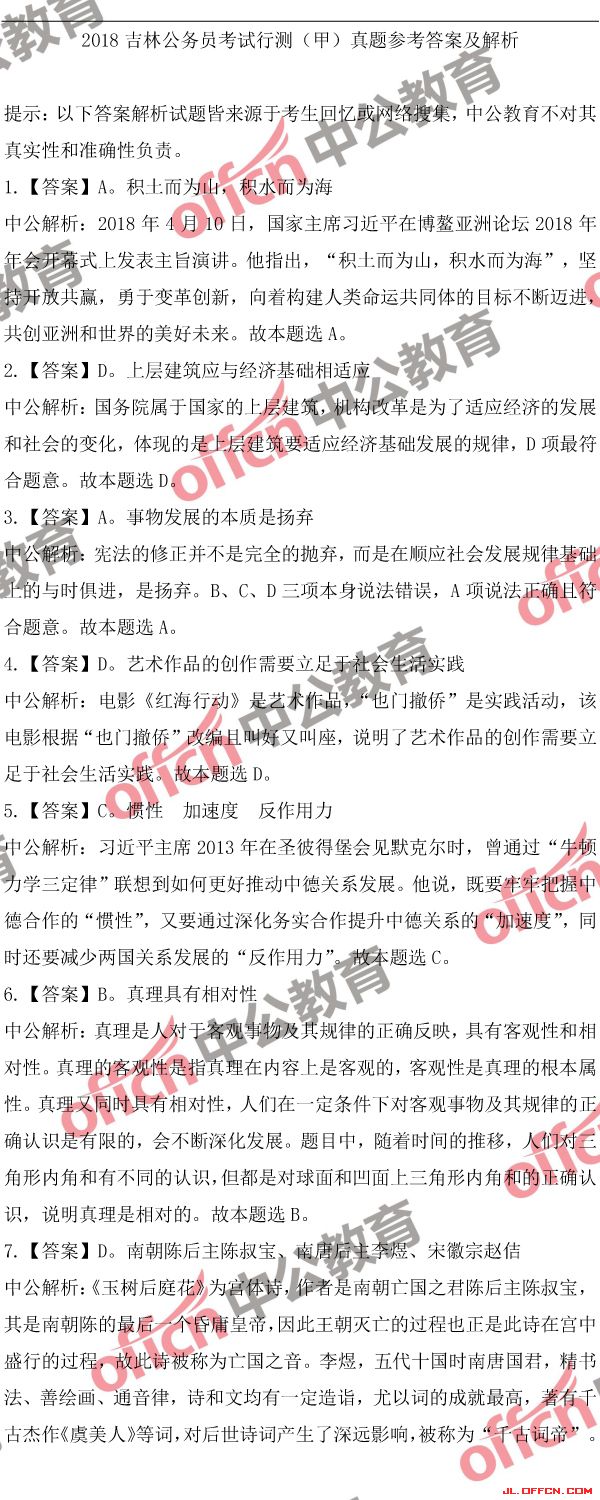 2018吉林公務員考試行測(甲)歷年參考答案及解析