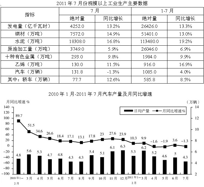 A. 表中產(chǎn)品2011年7月產(chǎn)量同比增速均慢于上半年