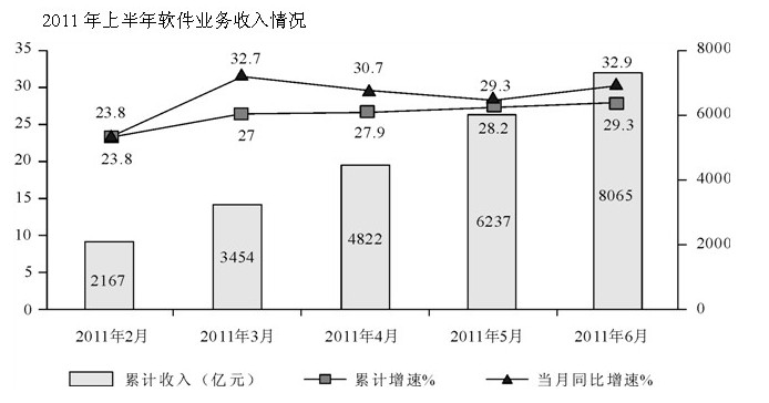 2011年上半年,我國(guó)軟件產(chǎn)業(yè)實(shí)現(xiàn)軟件業(yè)務(wù)收入8065億元,同比增長(zhǎng)29.3%,增速比去年同期高0.2年百分點(diǎn);實(shí)現(xiàn)利潤(rùn)103億元,同比增長(zhǎng)34.9%。其中,6月份完成軟件業(yè)務(wù)收入1828億元,同比增長(zhǎng)32.9%,增速比5月份回升3.6個(gè)百分點(diǎn)。