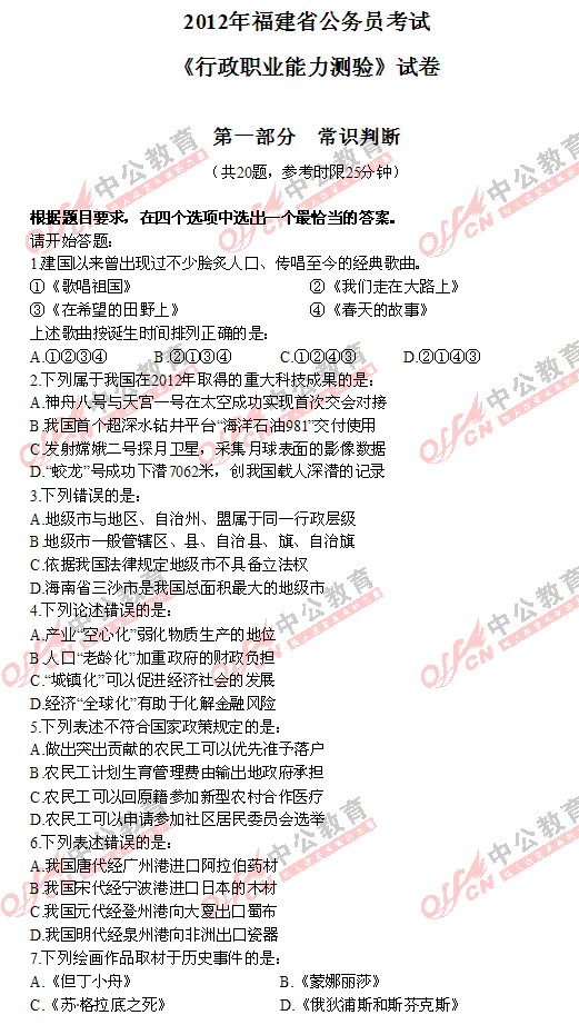 2012年福建秋季省考行測